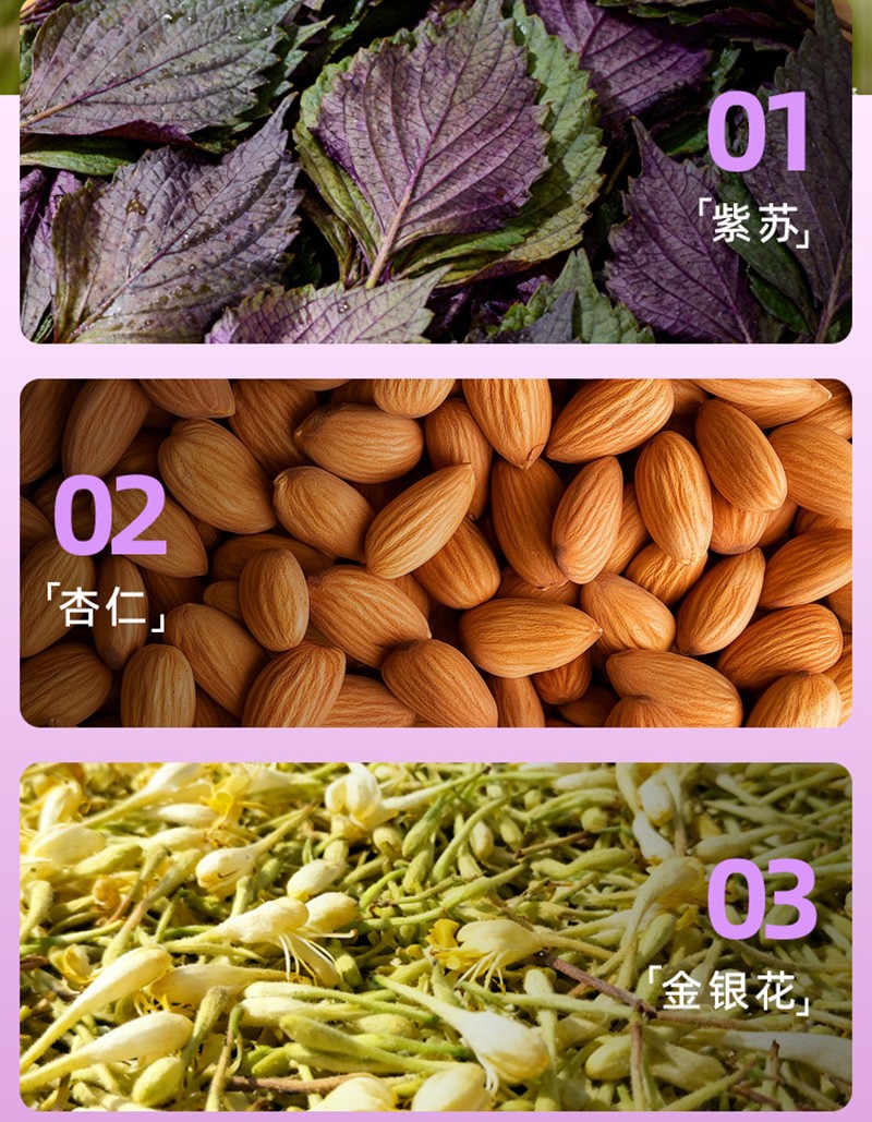 【配料表】水、木糖醇、紫蘇(10%)、杏仁(8%)、金銀花(5%)、牛肺肽(300mg/瓶)、蘋果濃縮汁、甘草、大棗、干姜、甜菊糖苷、檸檬酸、檸檬酸鈉、山梨酸鉀
